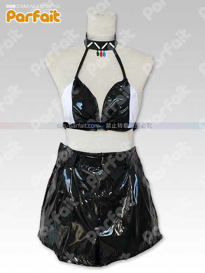 インナーにあたるブラトップ、ホットパンツは光沢のあるエナメル系の合皮、ジャケットは裏地付きのツイル生地で質感を高めています。袖のベルトはロゴをプリントしたベルトを制作しました。