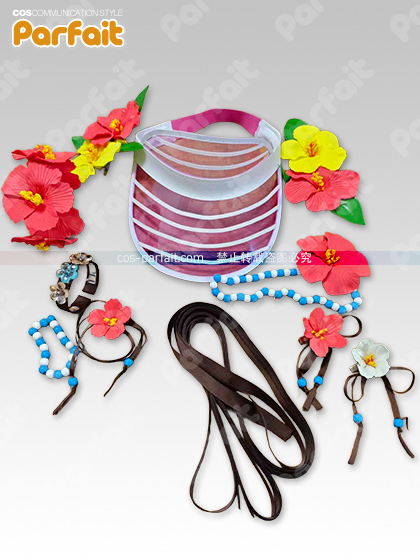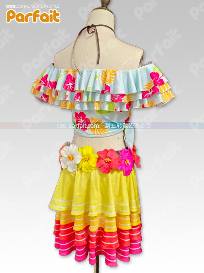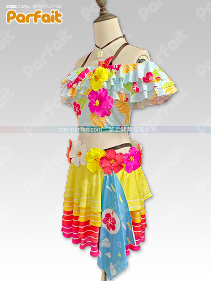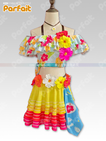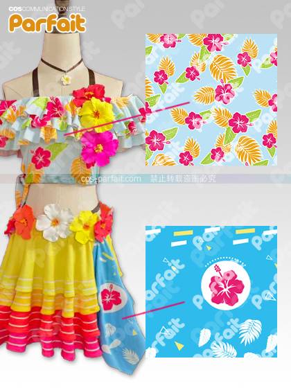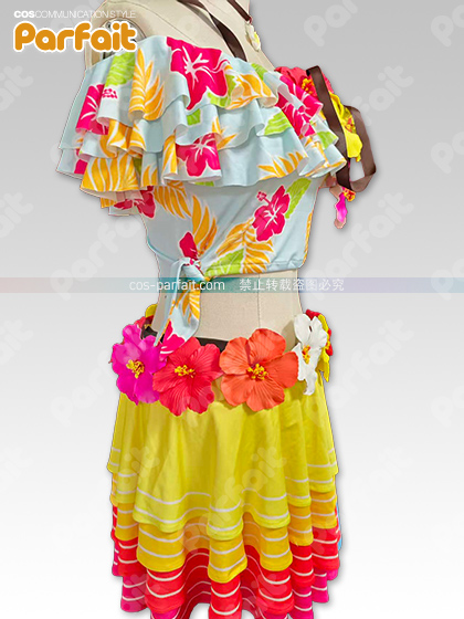 トロピカルな雰囲気の衣装で、ハイビスカスの花は造花です。
