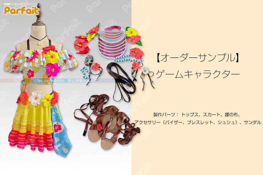 スカートやトップスはハイビスカスの花などをデザインを昇華プリントで再現しました。